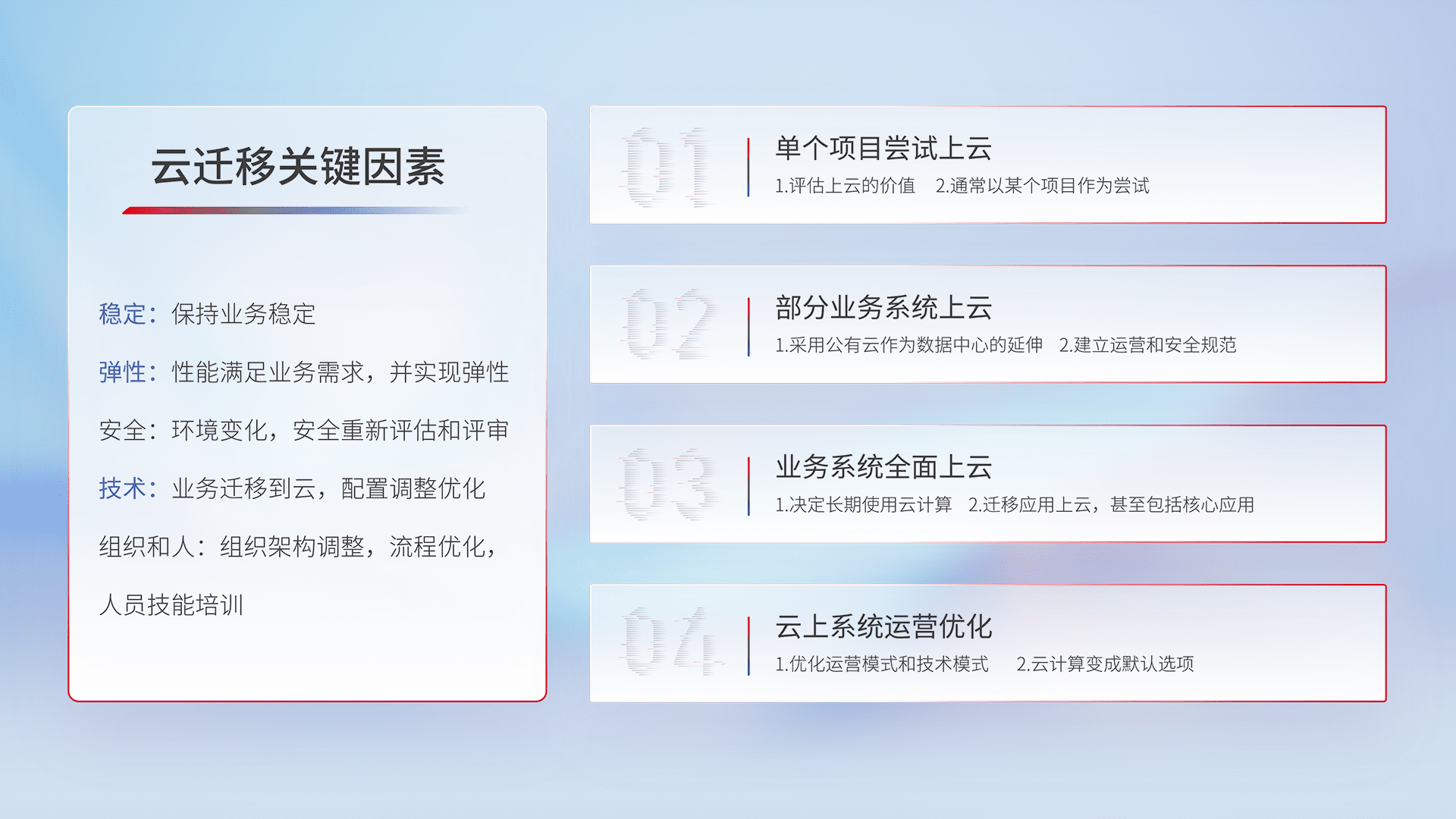 结合实际业务,,从规划设计、、、云平台选型、、云原生改造、、、数据迁移、、、、集成交付,,,,迁移全过程为客户识别最佳上云路径,,,做好风险识别管理,,设计网络架构、、、身份权限、、安全审计合规、、、、操作审计、、、日志审计、、、监控告警策略、、、、多站点容灾设计等,,对云上基础设施进行整体规划,,,提升IT治理水平,,以满足弹性、、、高可用、、、高性能的需求。。。。