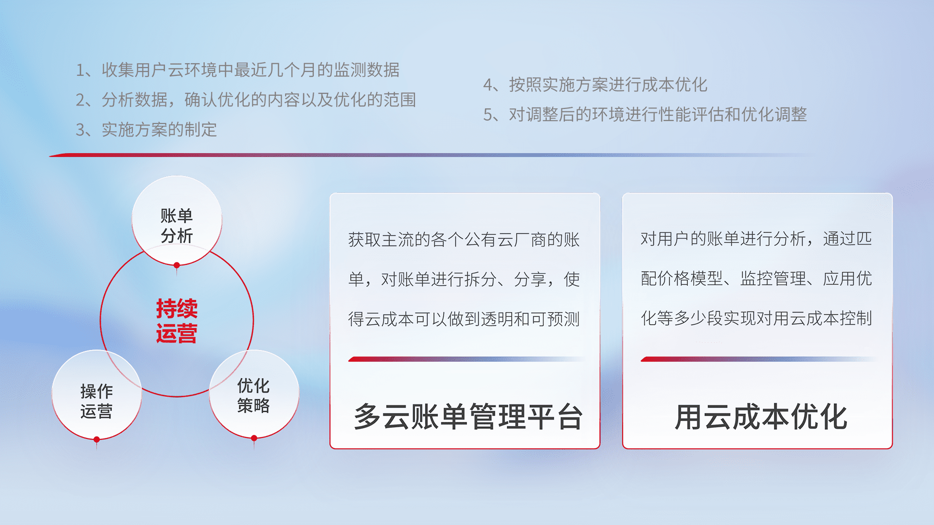 通过多云纳管,,,以统一的资源数据模型把客户的云资源进行抽象和封装,,,,进而实现对多云资源的统一操作,,保障云资源管理的可靠性、、稳定性与可用性。。。量身定制化运维内容,,,配置、、、开发运维、、补丁管理、、、备份、、、、监控、、、认证和访问管理、、、审计和日常巡检等,,,,保障在用云过程中的可靠度,,,,稳定度以及高可用率。。。。
